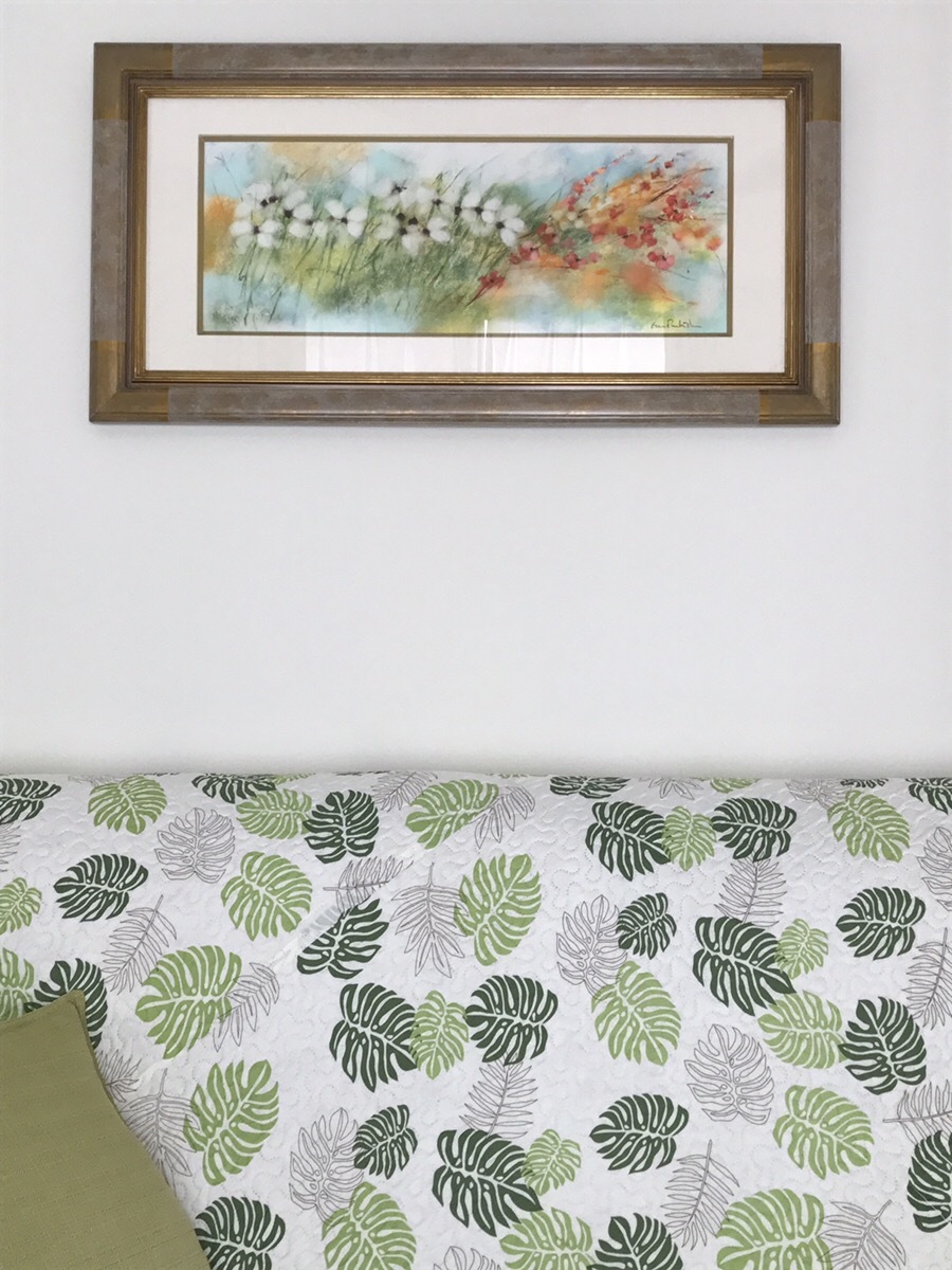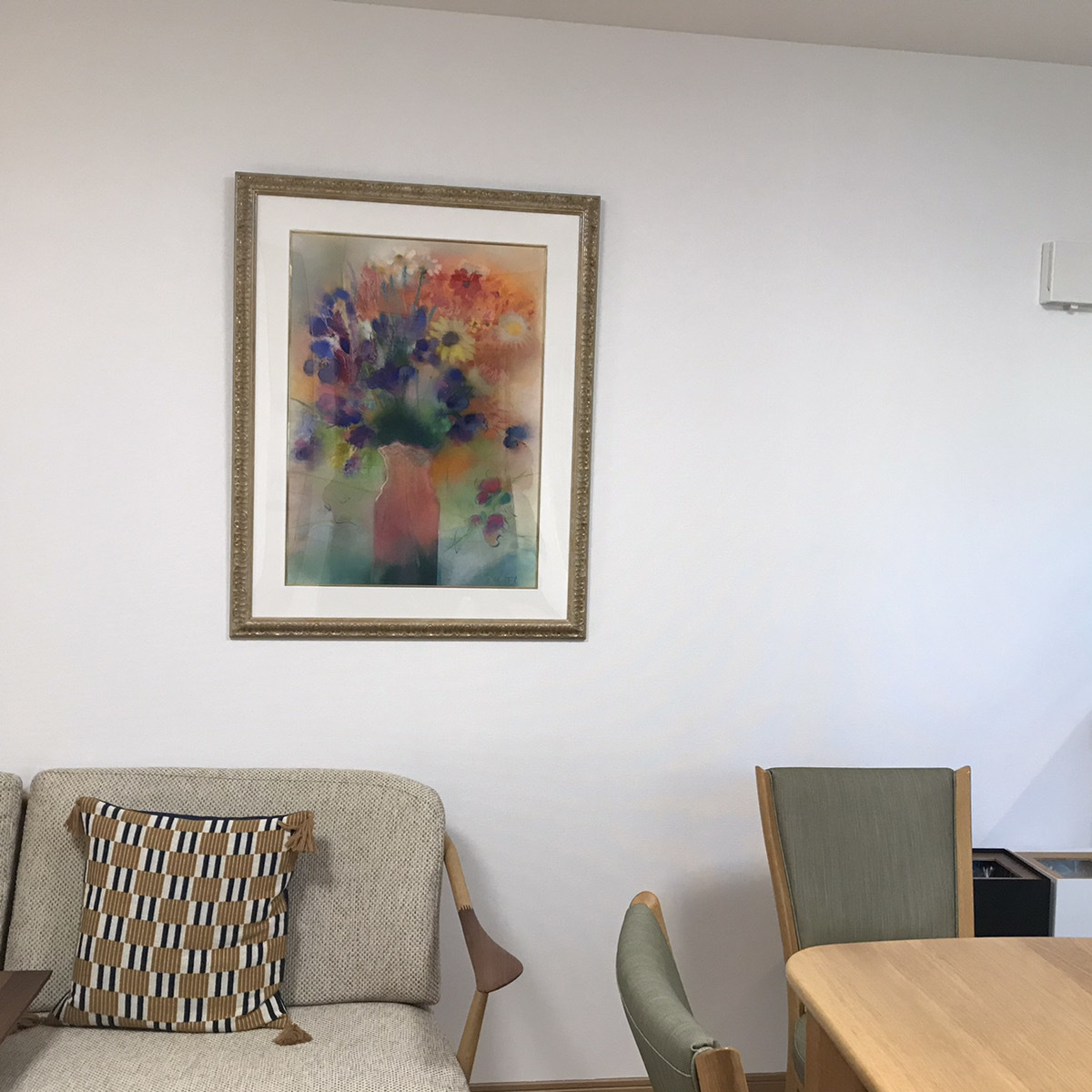 今回、ジェリーリンジーのお花の絵とマッチして、若草色のソファともよく馴染み、明るい穏やかな空間が出来上がりました。
