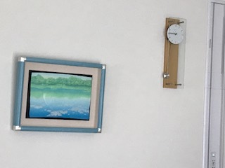 シーグリーンの額縁、作品の色が、リビングのアクセントクロス、掛け時計の色とマッチして、私の好きな色が心地良く目に入ってきます。