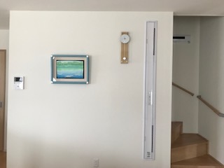 向って左から、スイッチ、絵、時計、全館空調のシステム機の左角が見事に一直線に並びました!!