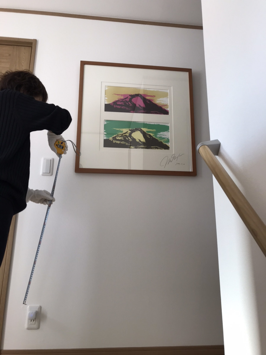 絵を掛ける位置決めの時、ご主人様と奥様はソファでご覧頂いて、ご主人様が「ハイ!その位置で。」と決められたのがこの写真↓